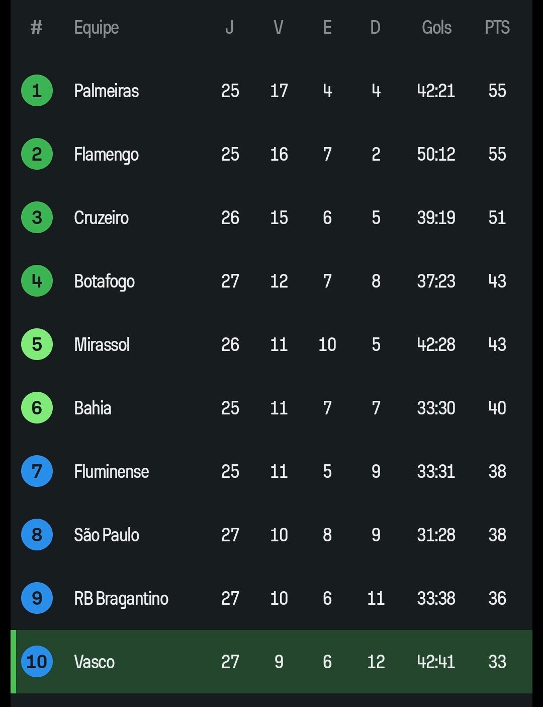 Triunfo contra o Vitória faz o Vasco ficar em 10°; tabela
