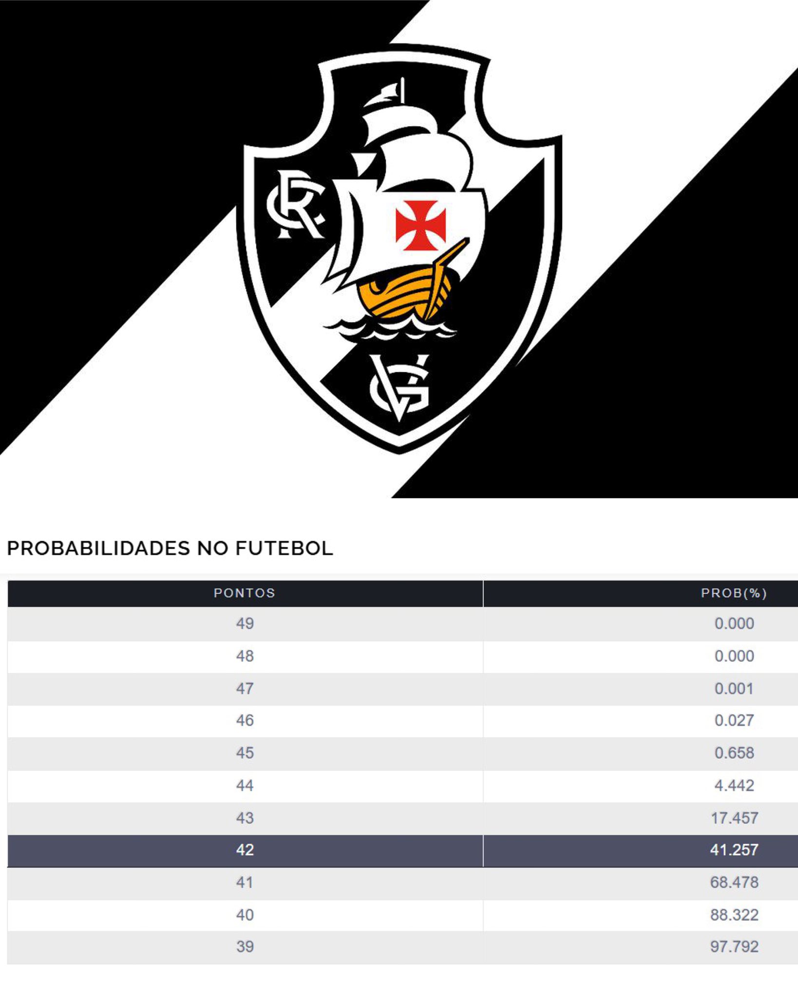 Como o Vasco desaprendeu a jogar futebol, aqui vão as contas para os desesperados: 41,2% de chance de rebaixamento se perder todos os jogos. Um empate deve bastar para escapar, mas só se garante mesmo com os famosos 45 pontos. Lamentável nos prestarmos a esse papel de novo!