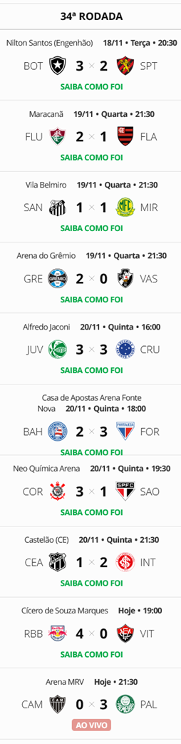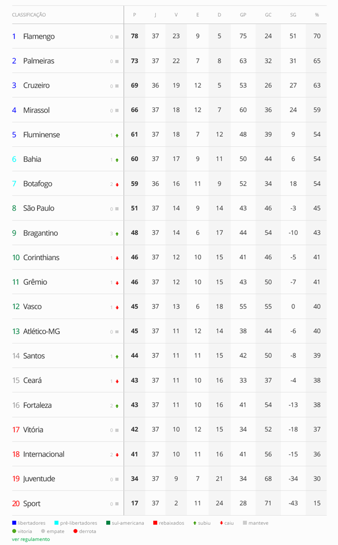 A 4ª-feira teve, além dos jogos da 37ª rodada, mais duas partidas atrasadas da 34ª rodada. O Vasco vai para a última rodada do Brasileiro na 12ª colocação, livre da ameaça de rebaixamento e sem chance de ir à Libertadores, e ainda lutando por uma vaga na Copa Sul-Americana