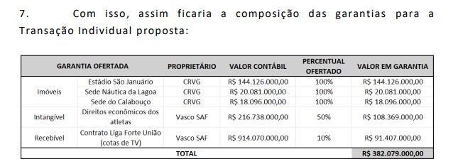 As garantias oferecidas para o pagamento dos impostos da associação englobam os imóveis do Vasco, como São Januário e as sedes da Lagoa e do Calabouço, e direitos econômicos de jogadores e direitos de TV, que pertencem a SAF.