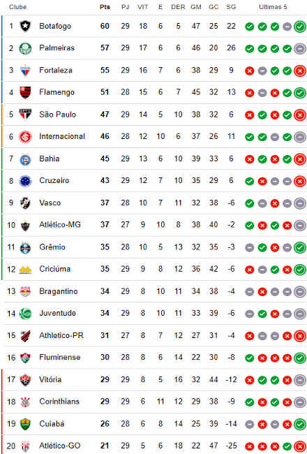 Assim estava a classificação do Campeonato Brasileiro após a 29ª rodada no ano passado.