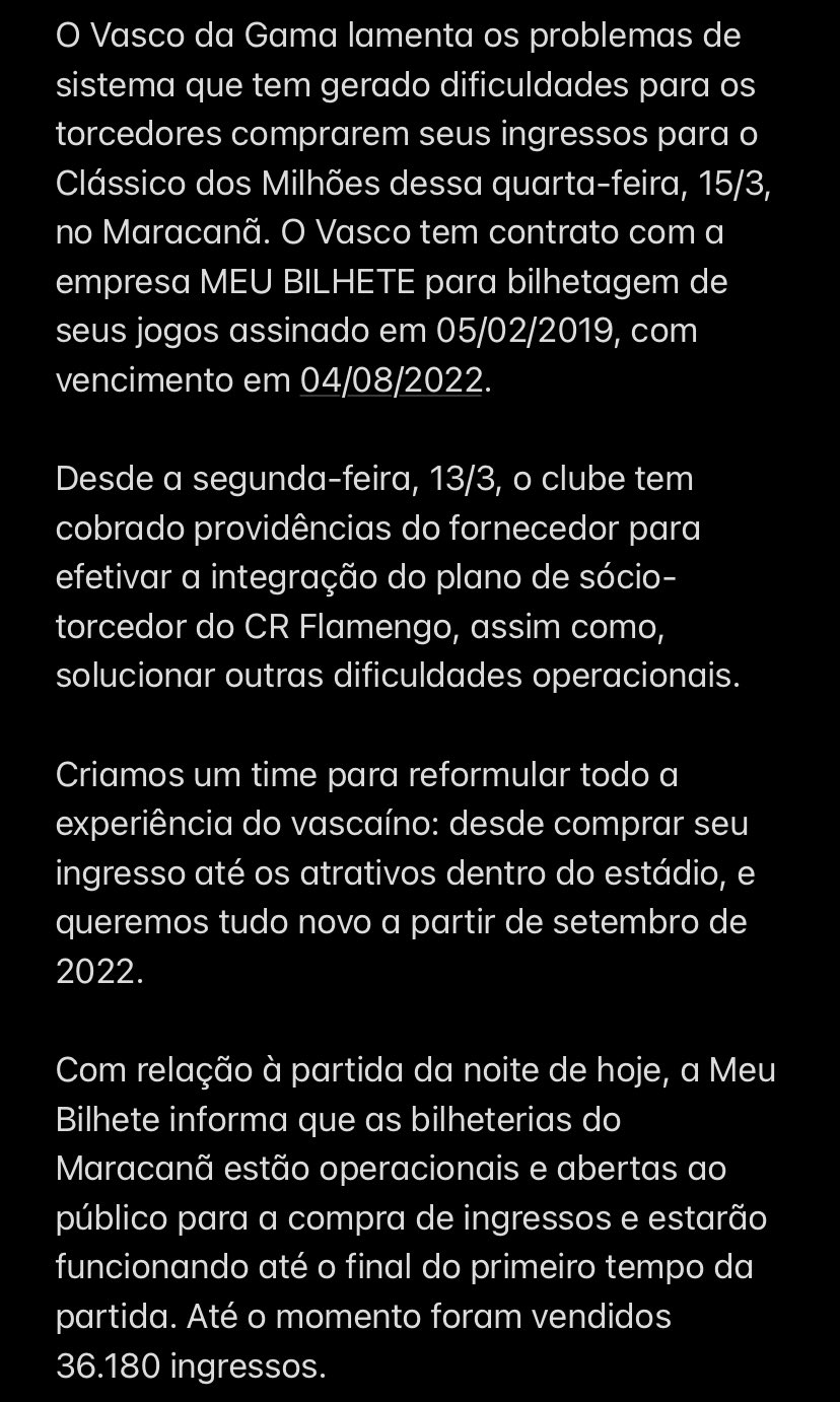 Vasco divulga nota oficial sobre os problemas com a comercialização de ingressos: