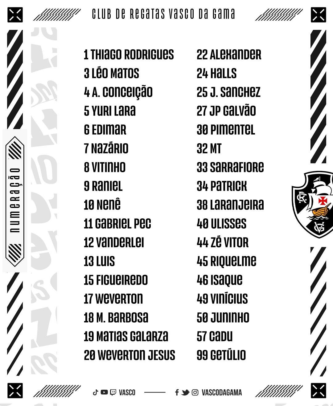 Vasco divulga numeração dos jogadores para a temporada 2022