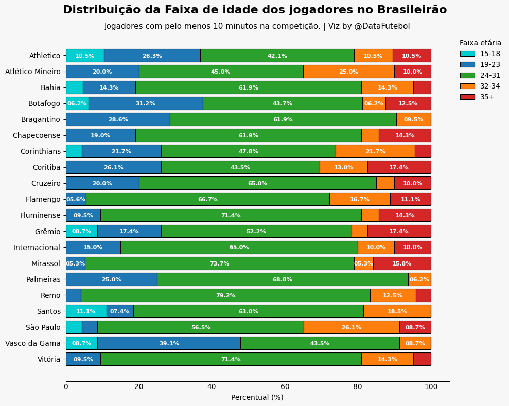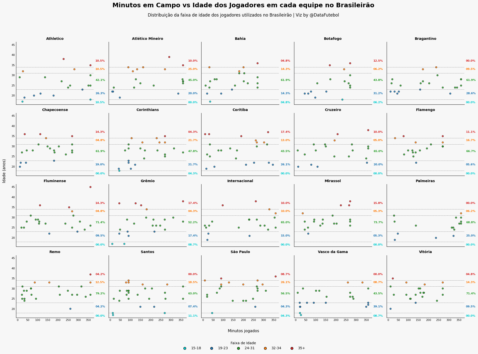 Aqui fiz uma versão com a distribuição dos minutos e da idade dos jogadores que estiveram em campo pelo menos 10 minutos de cada time no Brasileirão.
