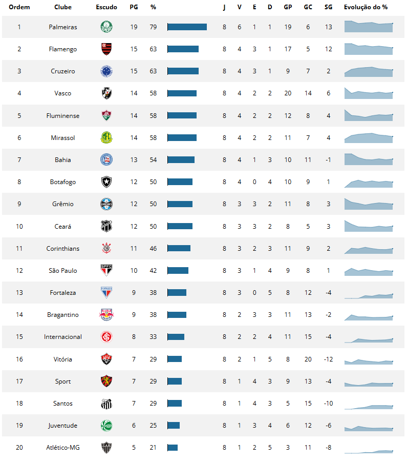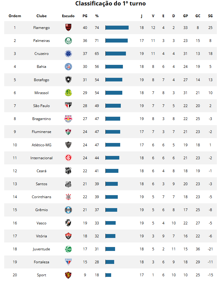 Relembre abaixo a classificação do primeiro turno do campeonato. São 12 equipes com ao menos um jogo ainda por realizar pela primeira metade do campeonato. Dos jogos disputados, Flamengo, Palmeiras, Cruzeiro e Bahia têm as quatro primeiras campanhas.