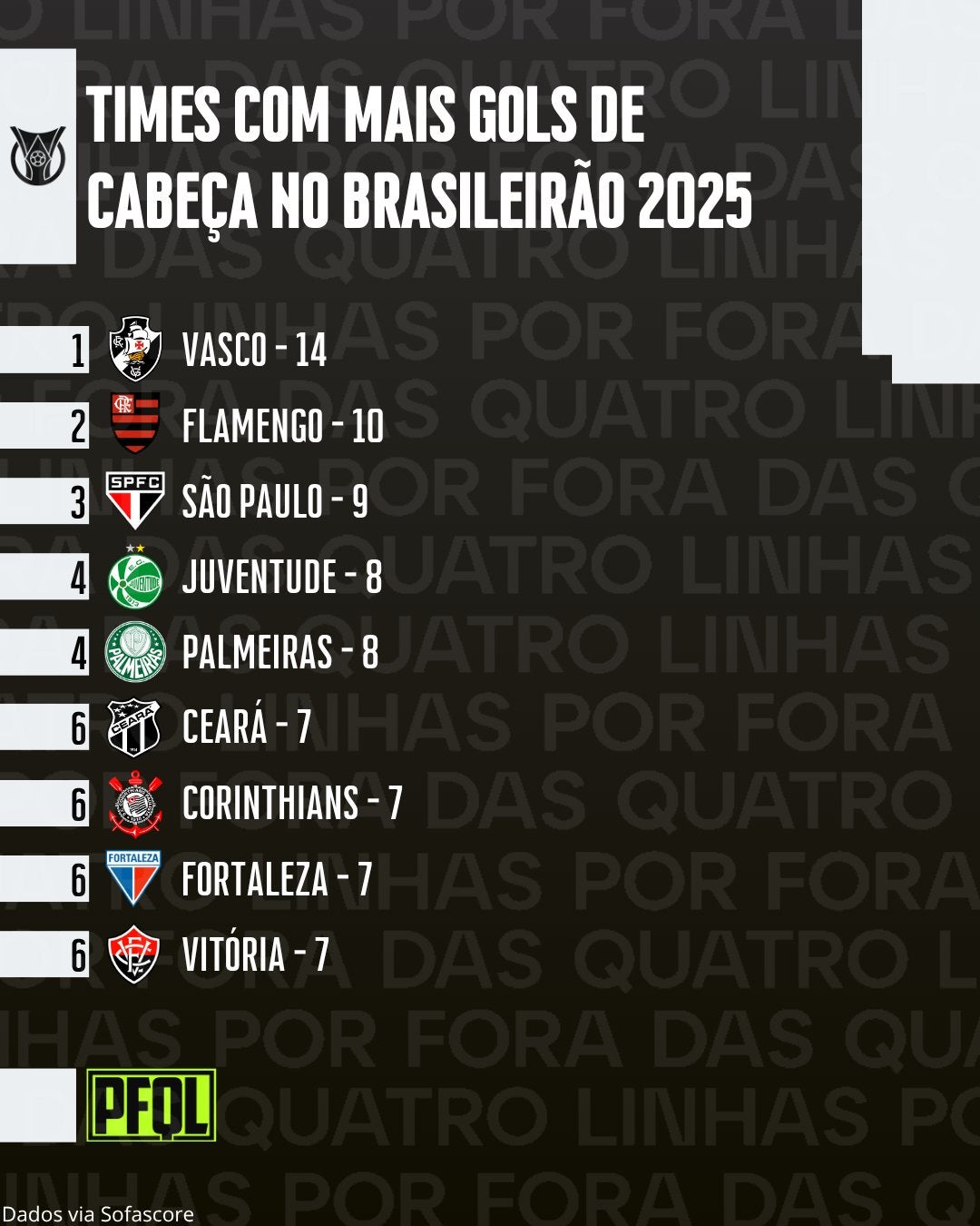 💢 Atendendo a pedidos, mais um ranking na PFQL: O Vasco é, com folga, o time que mais fez gols de cabeça no Brasileirão 2025 - 14. Desses, 4 foram de Pablo Vegetti, que lidera o Brasileirão no quesito.