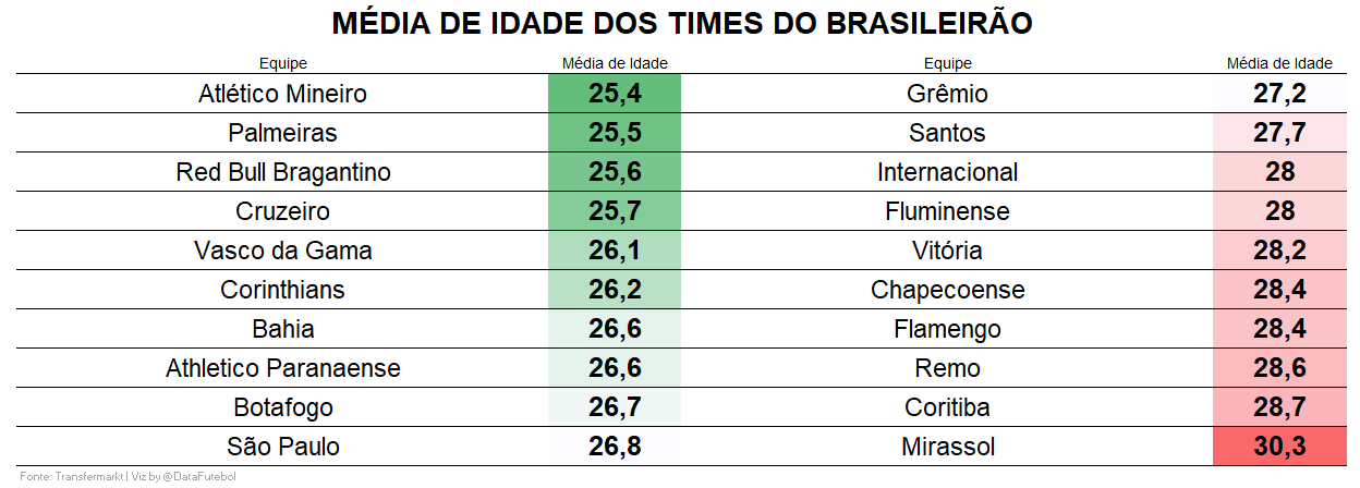 A MÉDIA DE IDADE dos ELENCOS de cada time do Brasileirão, de acordo com o Transfermarkt.