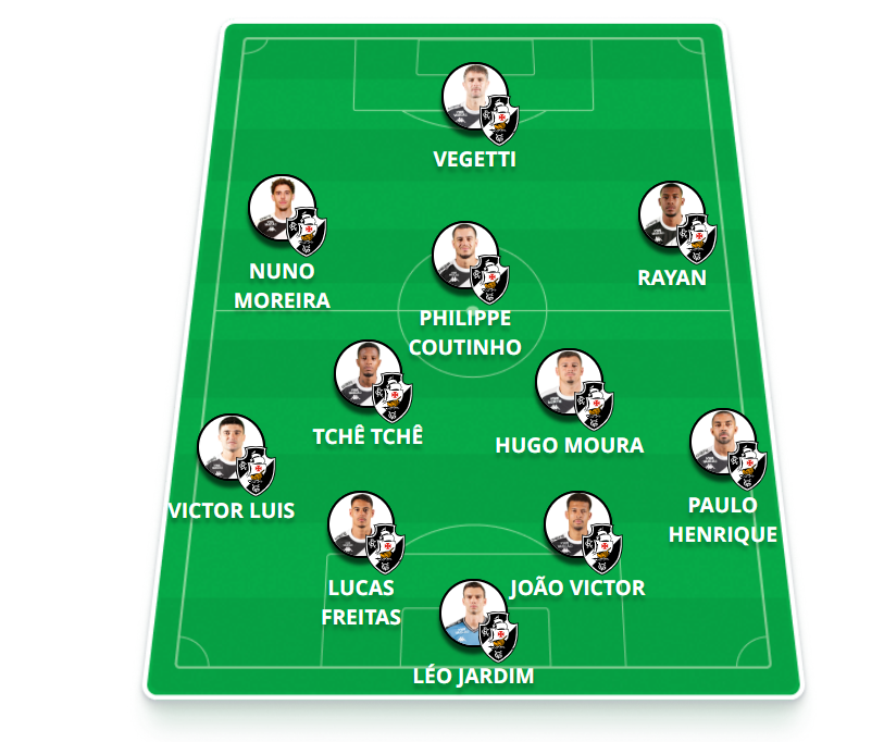 Provável escalação: Léo Jardim, Paulo Henrique, João Victor (Hugo Moura), Lucas Freitas, Victor Luís, Hugo Moura (Jair), Tchê Tchê, Coutinho, Nuno Moreira, Rayan e Vegetti.