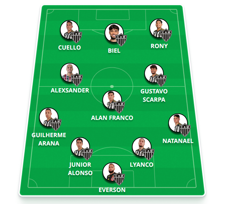 Provável escalação: Everson, Natanael, Lyanco, Alonso (Igor Rabello), Arana, Alan Franco, Scarpa (Igor Gomes), Alexsander, Biel, Cuello, Rony
