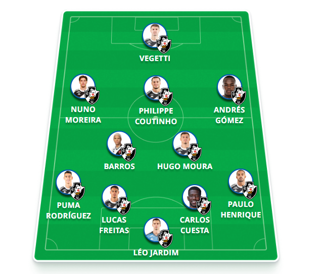 A provável escalação do Vasco: Léo Jardim; Paulo Henrique, Carlos Cuesta, Lucas Freitas, Puma Rodríguez; Hugo Moura, Barros, Coutinho; Andrés Gómez, Nuno Moreira (David) e Vegetti.