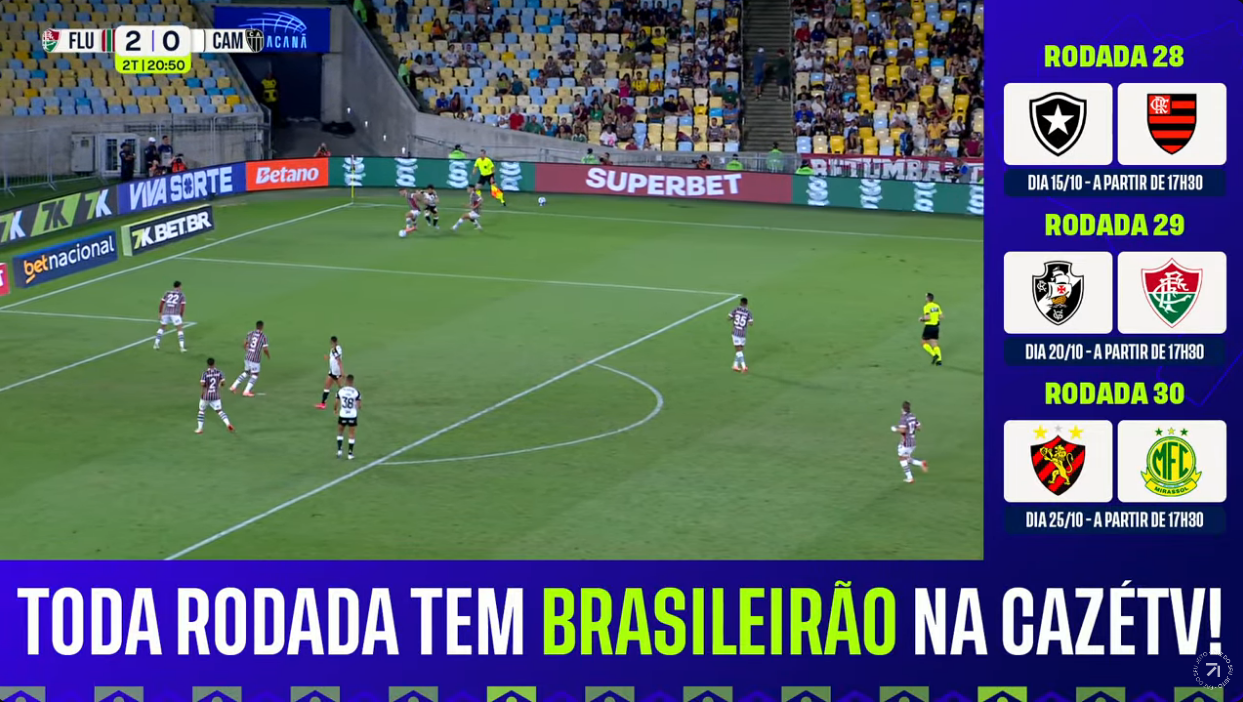 A transmissão da CazéTV informou que Vasco x Fluminense, clássico que acontecerá no dia 20/10, será transmitido pelo canal. A partida acontecerá no Maracanã, válido pela 29ª rodada, a partir de 17h30.