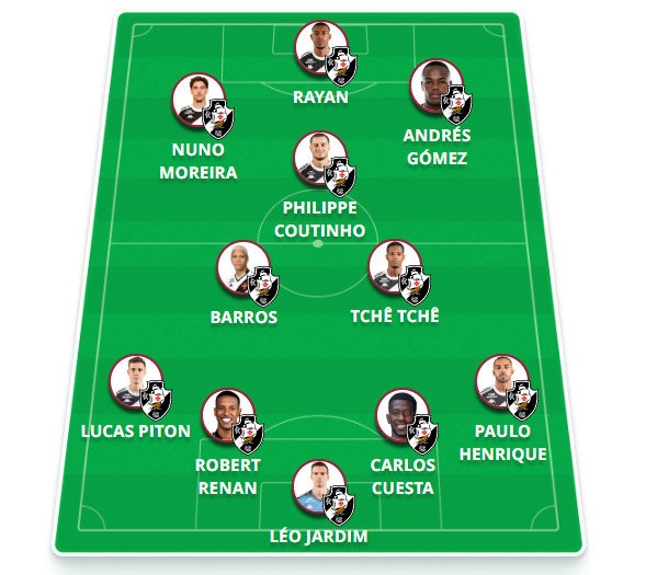 A provável escalação do Vasco: Léo Jardim, Paulo Henrique, Carlos Cuesta, Robert Renan, Lucas Piton; Barros, Tchê Tchê, Coutinho; Andrés Gómez, Rayan e Nuno Moreira,