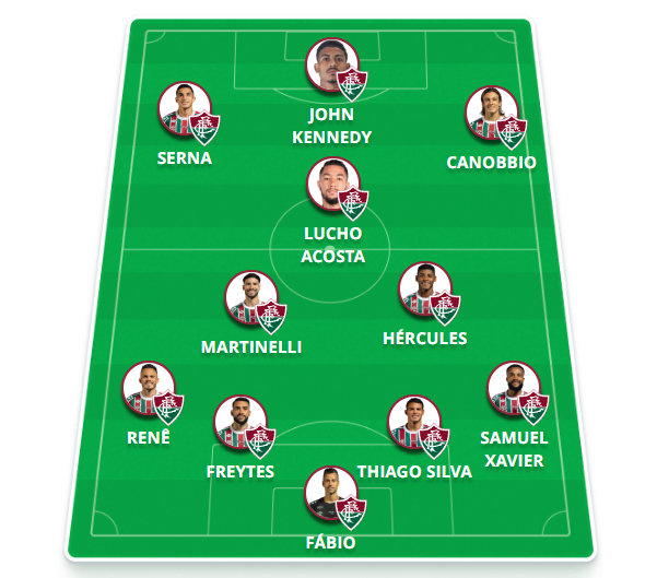 A provável escalação do Fluminense: Fábio, Samuel Xavier, Thiago Silva, Freytes e Renê; Hércules, Martinelli e Lucho Acosta; Canobbio, Serna e John Kennedy