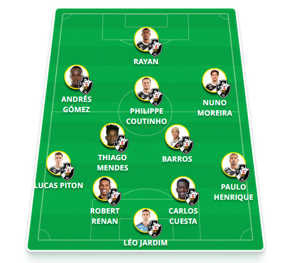 A provável escalação do Vasco: Léo Jardim, Paulo Henrique, Carlos Cuesta, Robert Renan e Lucas Piton; Barros, Thiago Mendes e Coutinho; Nuno Moreira, Andrés Gómez e Rayan.