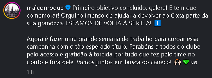 Agora é fazer uma grande semana de trabalho para coroar essa campanha com o tão esperado título. Parabéns a todos do clube pelo acesso e gratidão à torcida por tudo que fez pelo time no Couto e fora dele. Vamos juntos em busca do caneco! 🙌🏻💚🇳🇬