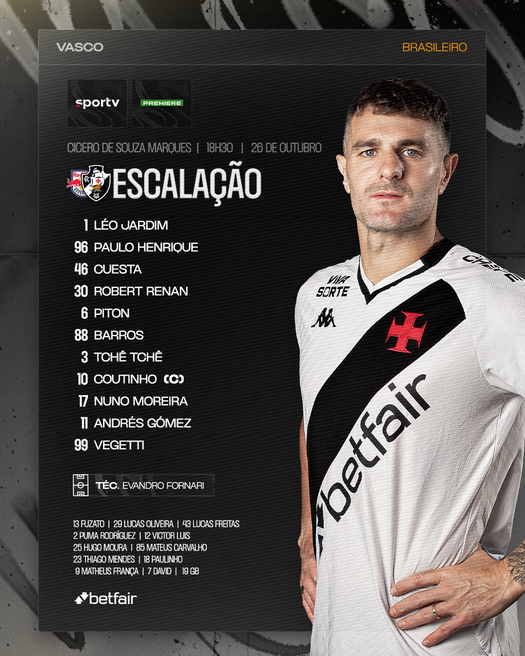 𝗧𝗶𝘁𝘂𝗹𝗮𝗿𝗲𝘀 & 𝘀𝘂𝗽𝗹𝗲𝗻𝘁𝗲𝘀 do Vasco na partida diante do RB Bragantino 📋💢
