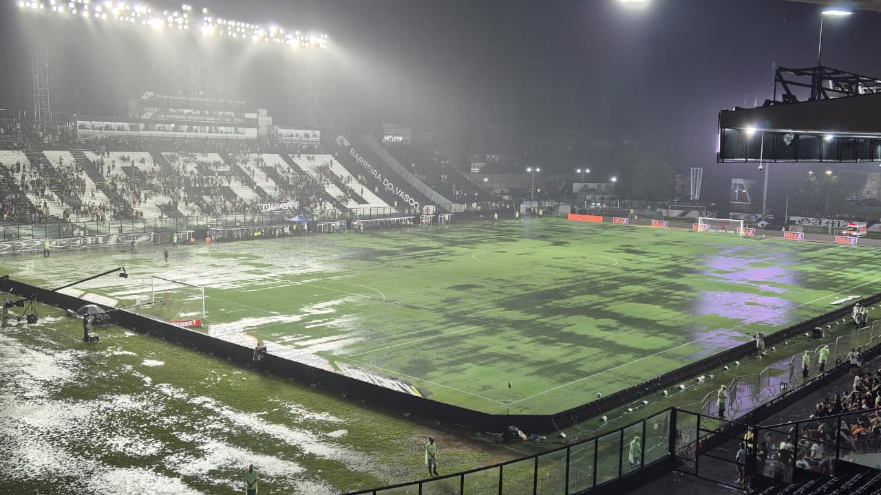 Assim ficou o gramado de São Januário por conta da forte chuva no Rio de Janeiro e atrasou o reinício do jogo entre Vasco e Internacional, pelo Brasileirão.