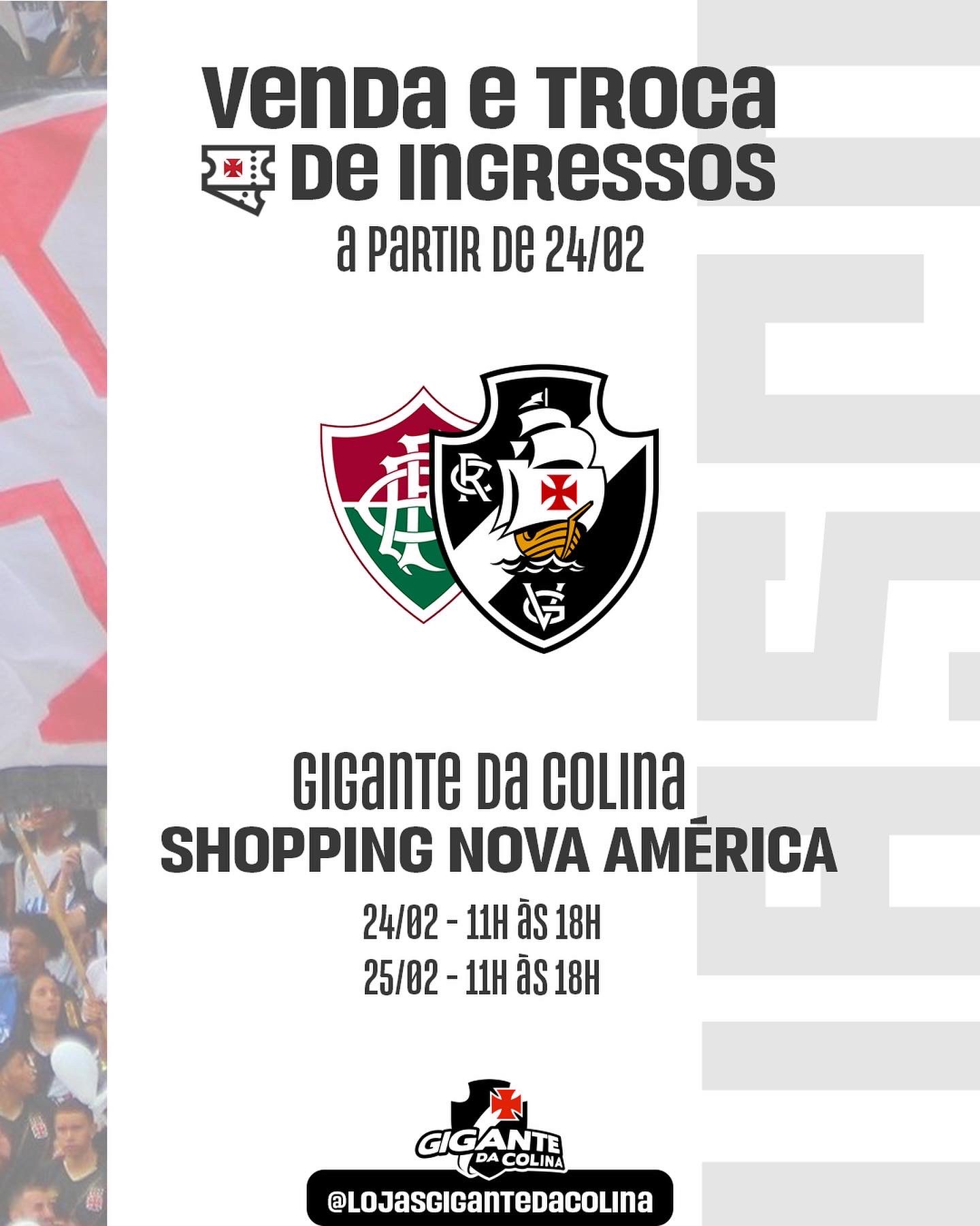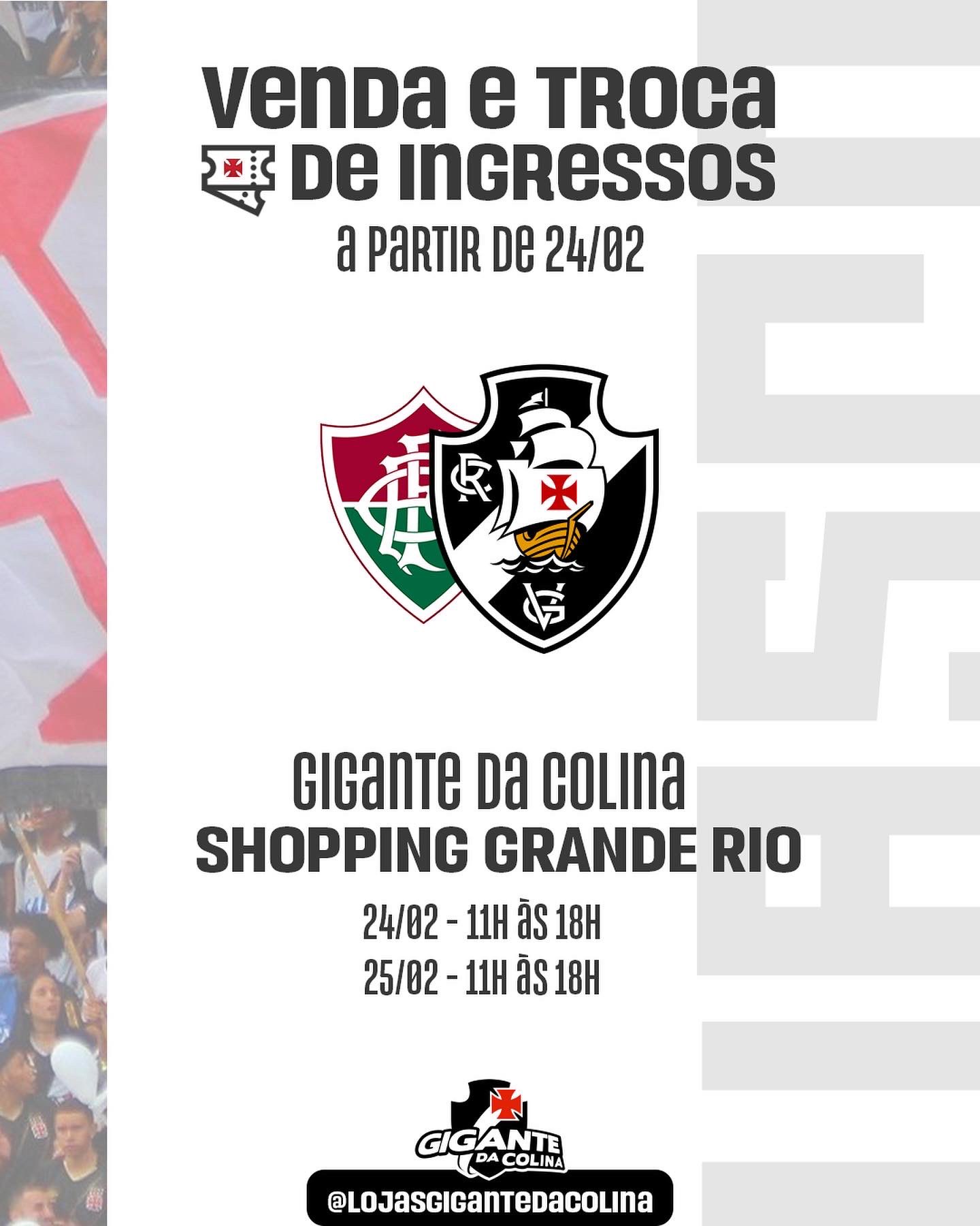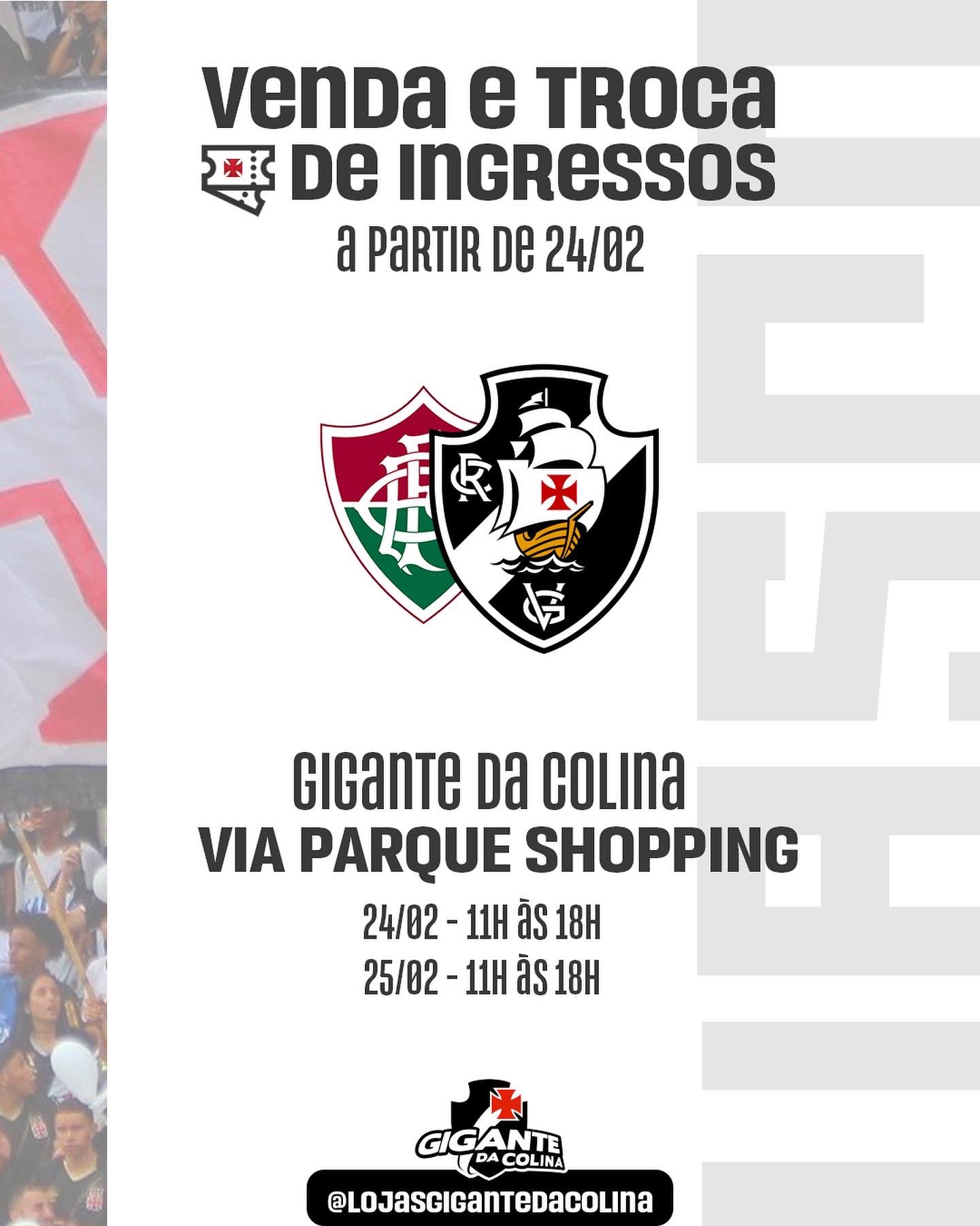 A partir de hoje (24/02) serão realizadas as VENDAS e TROCAS de ingressos nas lojas VIA PARQUE, GRANDE RIO e NOVA AMÉRICA para o jogo Fluminense x VASCO que acontecerá neste sábado (26/02). 💢