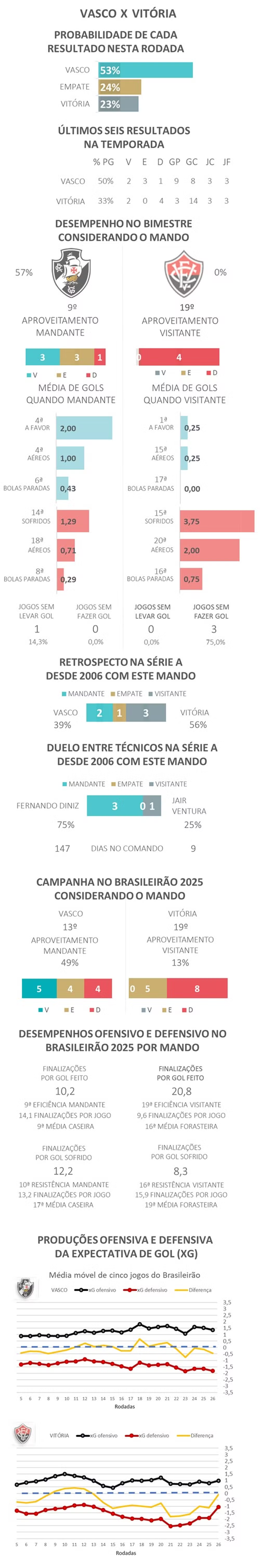 Defensivamente, o Vitória vem conseguindo aumentar sua capacidade de controlar o nível de ameaça de seus adversários (linha vermelha do gráfico de xG), mas o ataque segue produzindo pouco, o que dificulta sua reabilitação na competição. Nos últimos cinco jogos, o ataque do Vitória (linha preta do gráfico de xG) fez finalizações com características para um potencial estatístico de virar 0,98 gol, enquanto o ataque do Vasco está produzindo para 1,37 gol.