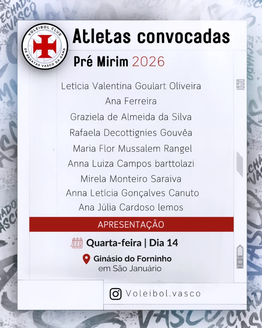 Atletas convocadas para a categoria Pré-Mirim. 📌Apresentação no Ginásio do Forninho, São Januário, na próxima 4af, dia 14/01/2026.