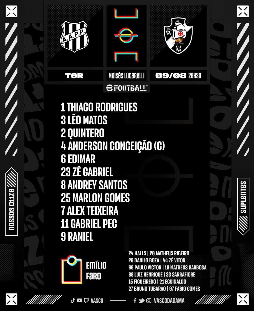 Vasco escalado com Alex Teixeira entre os titulares na vaga de Figueiredo, que fica no banco. Zé Gabriel e Marlon Gomes substituem os suspensos Yuri Lara e Nenê.